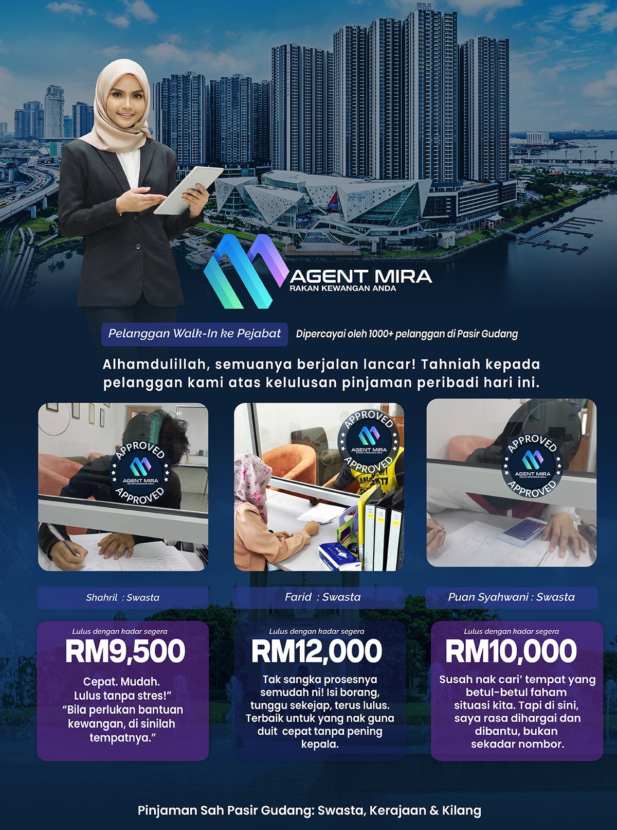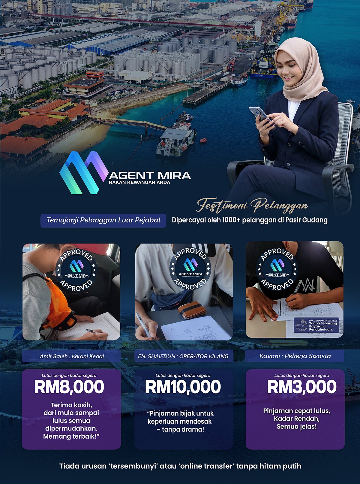 Apa khabar warga Pasir Gudang! Saya Agent Mira. Sebagai perunding kewangan peribadi yang telah membantu lebih 1000+ pelanggan di Johor, Mira sangat faham cabaran hidup di kota industri. Kadang-kadang, pusingan modal tak cukup atau ada hal kecemasan yang perlukan tunai segera.